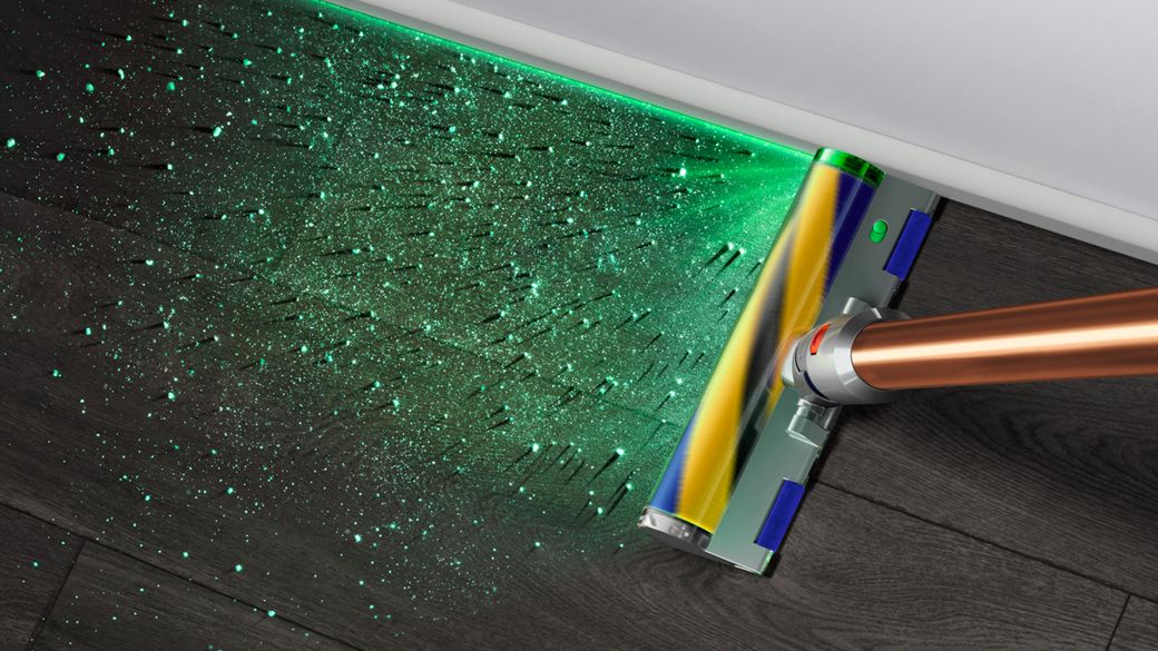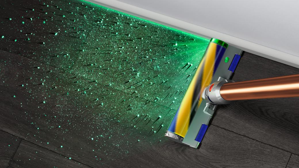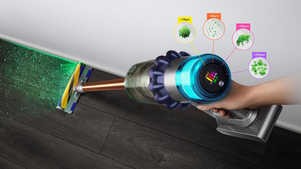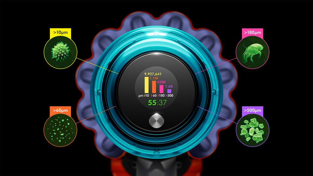 Dyson face ca praful invizibil să fie vizibil pe podele dure.1 Un senzor piezo măsoară și numără continuu particule de praf - creșterea automată a puterii de aspirație când este necesar. Ecranul LCD arată ce a fost aspirat în timp real.3